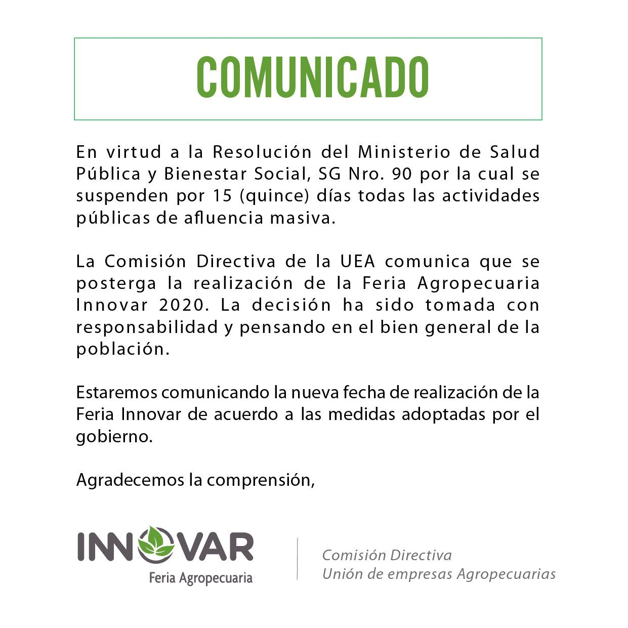 La Comisión Directiva de la Unión de Empresas Agropecuarias (UEA) determinó postergar la realización de la feria agropecuaria Innovar 2020 tras las medidas anunciadas por el Gobierno que buscan prevenir la propagación del coronavirus.