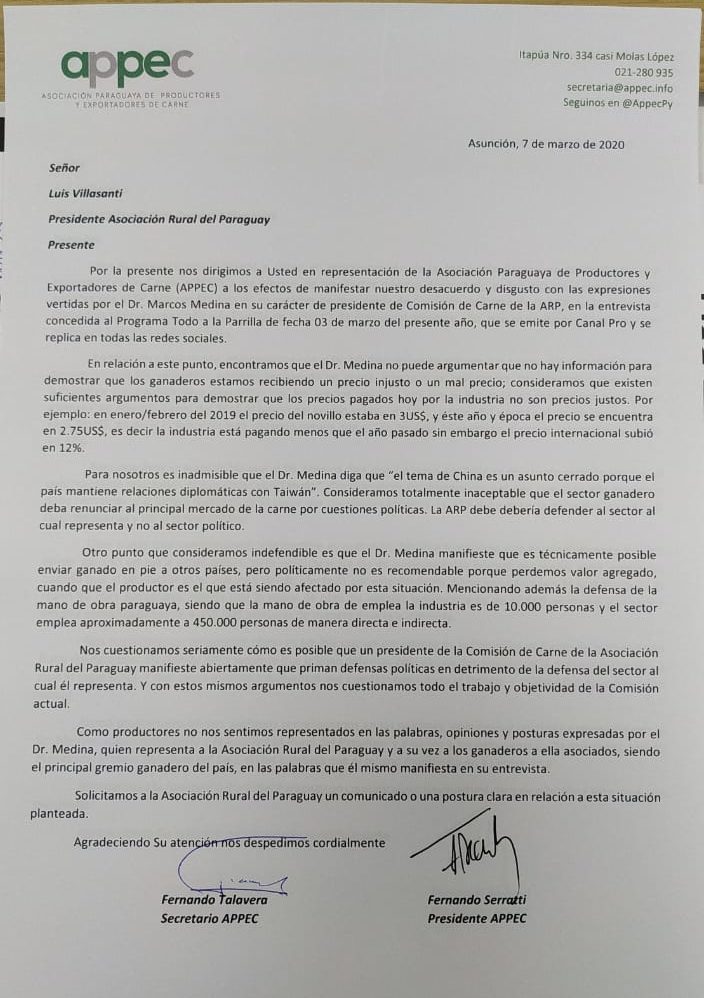 La Asociación de Paraguaya de Productores y Exportadores de Carne (APPEC) envió una carta al Presidente de la Asociación Rural del Paraguay (ARP) manifestando su “desacuerdo” y “disgusto” con las expresiones del Dr. Marcos Medina, actual presidente de de la Comisión de Carne de la ARP.