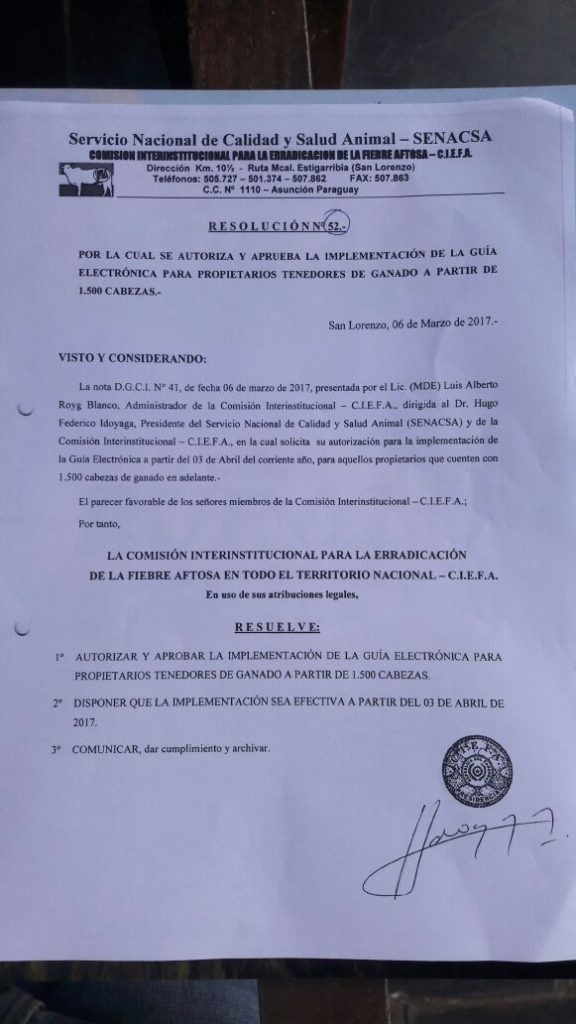 En la resolución Nº 52, del 06 de marzo de 2017, el Servicio Nacional de Calidad y Salud Animal (Senacsa) autoriza y aprueba la implementación de la guía electrónica para propietarios tenedores de ganados a partir de 1.500 cabezas.
