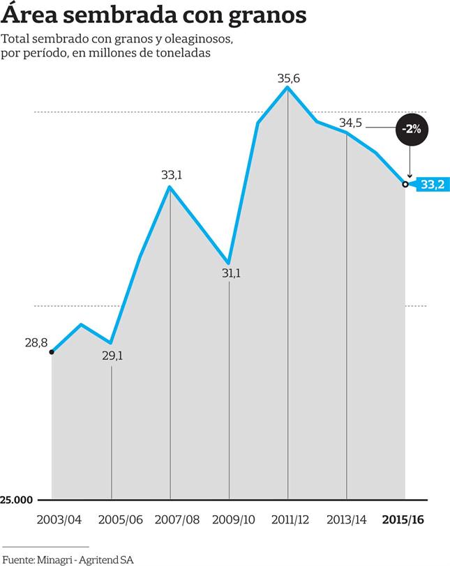 Para Agritrend, consultora del analista Gustavo López, la siembra total 2015/2016 (soja, maíz, girasol, trigo y otros granos) se ubicará en 33,2 millones de hectáreas, una disminución del 2 por ciento respecto del ciclo 2014/2015. Son 800.000 hectáreas menos.