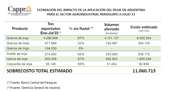 De acuerdo con la estimación que ha realizado la Cámara Paraguaya de Procesadores de Oleaginosas y Cereales (Cappro), considerando los volúmenes de exportación de productos del complejo soja, de maíz y trigo desde enero a julio de este año y el porcentaje de dichos volúmenes que utiliza la hidrovía, el sobrecosto que representa para el sector el cobro del peaje por parte de Argentina se ubicaría en torno a los US$ 11 millones.