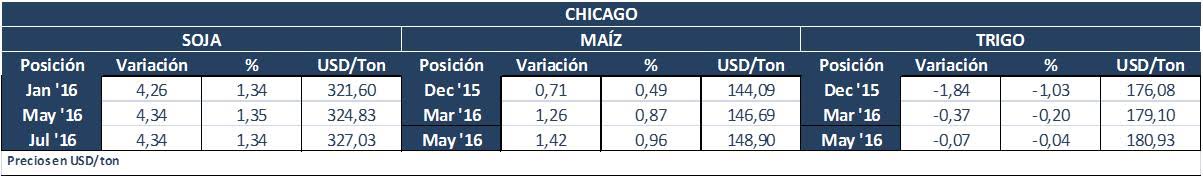 Parte del soporte, se debió también al aumento en el precio del aceite de palma en Asia, durante la operativa nocturna allí. Las lluvias comprenden también a las chacras de soja de Argentina y Brasil. El clima comercial en Argentina está bastante exacerbado, sobretodo basado en rumores, algunos de los que no son más que eso, como el de la eliminación temporal por 60 días de las retenciones a la soja, para terminar en un efecto de baja de 35 a 30%. El presidente electo, Mauricio Macri, tuvo que salir él mismo a desmentirlo.