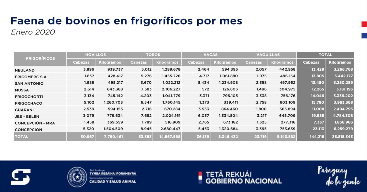 La faena de bovinos en Paraguay comenzó el año a un ritmo 9,5% menor en comparación a como se cerró la actividad en 2019. En enero de 2020 las plantas procesaron 144.218 cabezas, 15.165 menos frente a las 159.383 reses de diciembre pasado.