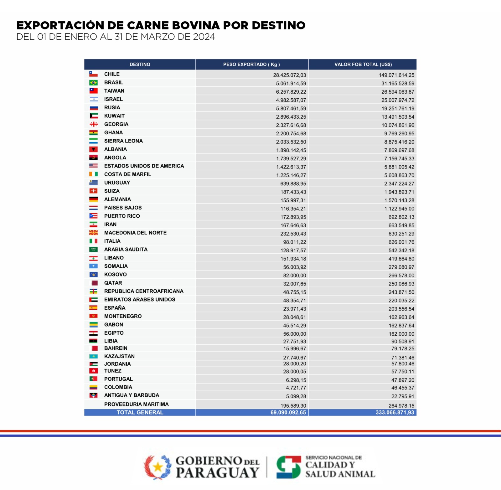 Para detallar, después de los mercados más conocidos donde llega el producto paraguayo aparece Kuwait, este destino ocupa el sexto lugar del ranking, con 2.896 toneladas exportadas en este primer trimestre del año, generando ingresos por US$ 13 millones. Le sigue Georgia, con 2.327 toneladas compradas por un valor de US$ 10 millones.