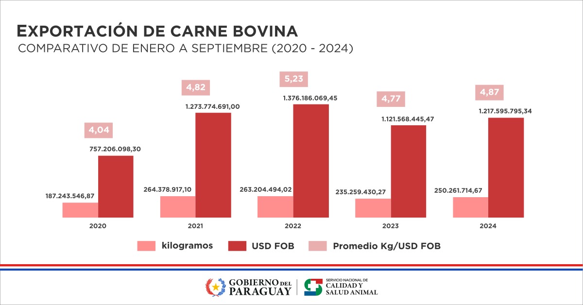 Ventas anuales. En cuanto al total de las exportaciones paraguayas, los datos reflejados en el boletín de Senacsa indican que, entre enero y septiembre, se colocaron en el mercado internacional unas 250.261 toneladas de carne por un valor de US$ 1.217 millones. Esto representa un aumento del 6% en volumen y del 9% en ingresos, en comparación con el mismo periodo del año pasado, cuando se enviaron 235.259 toneladas por un valor de US$ 1.121 millones.
