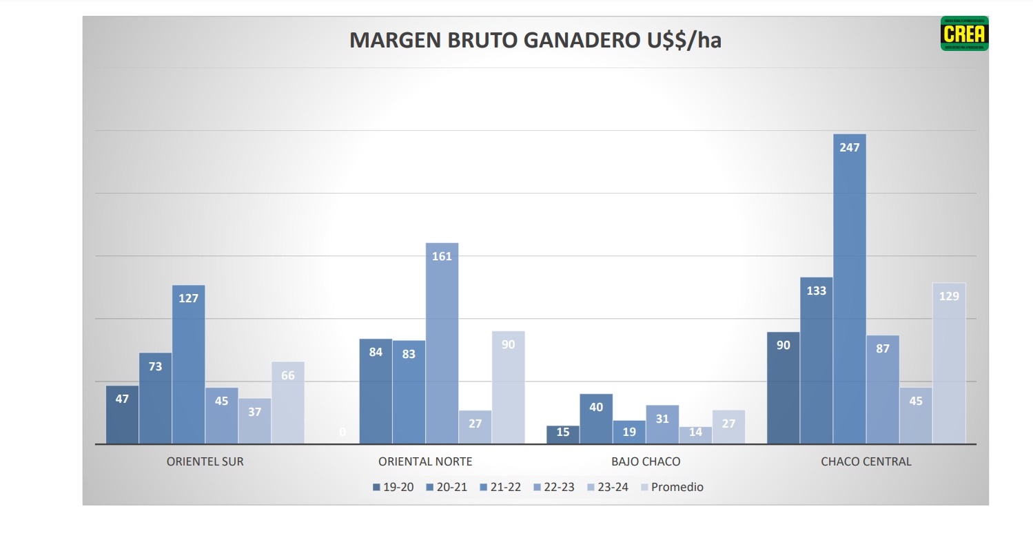 Resultados. De acuerdo al trabajo presentado por CREA Paraguay, las empresas analizadas en el Chaco Central obtuvieron un margen bruto de 45 dólares por hectárea, una disminución de US$ 42 en relación al periodo anterior (2022/23) y de US$ 84 versus el promedio histórico.