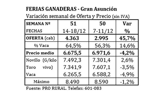 Los novillos se apreciaron casi 3%, pasando a un valor promedio de G. 7.492 y alcanzando el jueves un precio máximo de G. 8.490, siendo esa la cotización más alta de esa semana, y a la vez la cuarta menor del mercado ferial en este año.