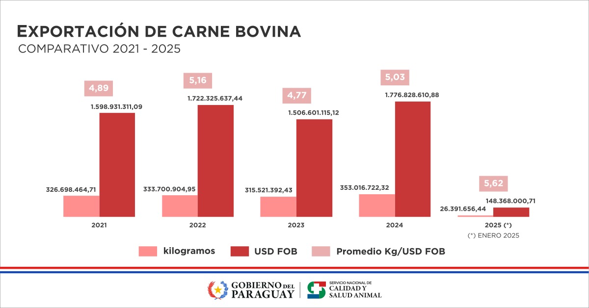 El complejo cárnico nacional inició este 2025 con mejores cifras de exportación, al colocar 26.391 toneladas de proteína roja en el mercado internacional durante el primer mes del año, un volumen superior al de 2024 y 2023, según el informe del Servicio Nacional de Calidad y Salud Animal (Senacsa).