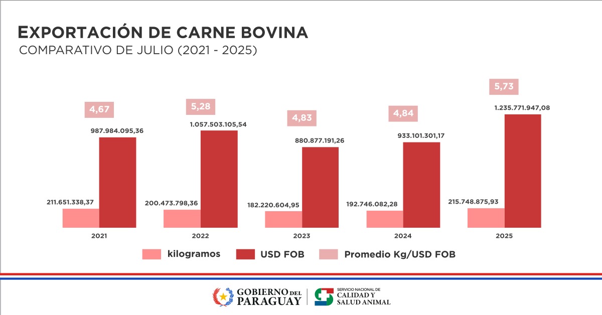En términos de valores, a julio los envíos de carne permitieron el ingreso de US$ 1.235 millones, lo que representa un aumento del 32,4 %, en comparación con el mismo periodo del año anterior cuando se generaron US$ 933 millones.