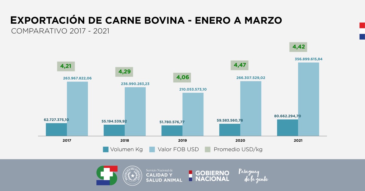 Las exportaciones paraguayas de carne bovina registraron un récord histórico en los primeros tres meses del año. En total se colocaron a los mercados 80.662 toneladas, un 35,7% más en comparación al mismo periodo del año pasado.
