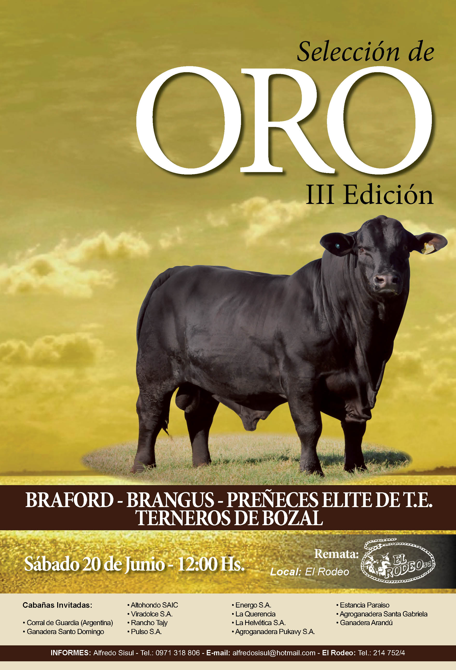 La tercera edición del remate Selección Oro que lleva acabo la firma El Rodeo con la participación de importantes cabañas nacionales y de Argentina se concretará el sábado 20 a las 12 horas en su predio tradicional poniendo en oferta de lo mejor en Brangus y Braford.