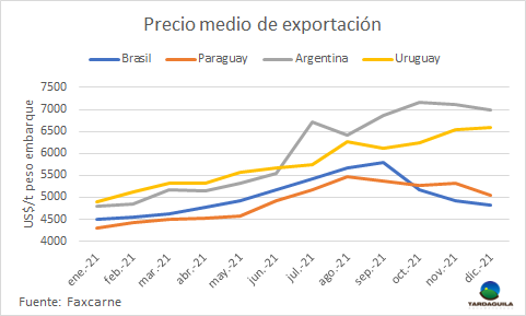 Faxcarne | Tras haber evolucionado al alza en forma conjunta durante los primeros ocho meses de 2021, el valor medio de exportación de carne vacuna de los cuatro países del Mercosur pasó a mostrar dos tendencias contrapuestas en el último tercio del año, con Argentina y Uruguay que siguieron en alza, en tanto que Brasil y Paraguay sufrieron presiones bajistas.