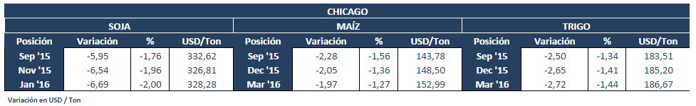 El cierre de la semana en Chicago no fue muy distinto al del resto de los mercados financieros. Es que el deterioro en el desempeño reciente de los indicadores chinos (acciones, moneda, actividad industrial) actúa como un terremoto, que se va replicando en la economía mundial y así cayó el pasado viernes todo lo que no fuese oro y bonos de EEUU, ambos refugios demandados en estos casos, en lo que prima la seguridad sobre el ánimo de lucro. La bolsa de Shangai cerró una semana de terror, bajando 4% sólo el viernes, acumulando así una caída semanal de 12%. En otras palabras: en sólo cinco días, el valor promedio de las acciones que cotizan en ese mercado vio evaporarse su valor en un 12% vs sólo diez días antes.