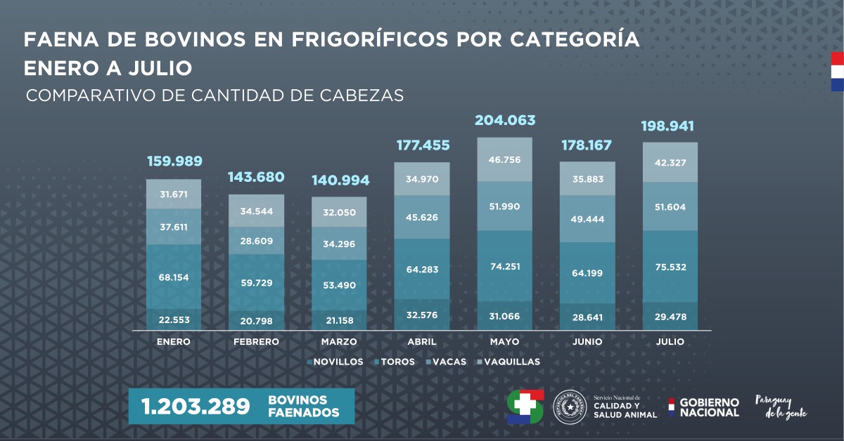 El informe del Servicio Nacional de Calidad y Salud Animal (Senacsa) reflejó que los frigoríficos exportadores faenaron en julio 198.941 cabezas de vacunos, lo que representó un aumento del 12% en comparación con junio que registró 178.167 cabezas.
