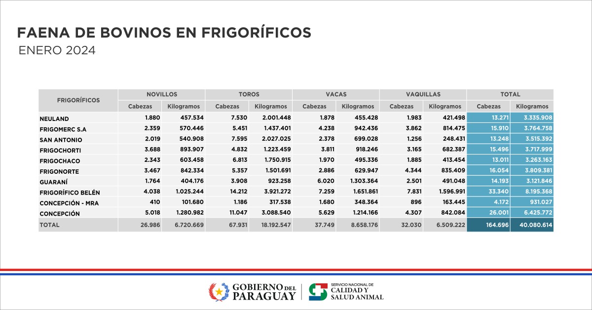 Comparando estos números con la faena de enero del 2023, se tuvo un incremento en los ingresos de novillos de más de 4.433 cabezas, al tiempo que también hubo un aumento en las hembras, con 138 vacas y 359 vaquillas más.