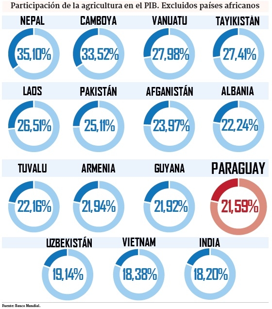 Más evidente se hace al hacer un listado de los países que más dependen de este sector donde, si excluimos África, Paraguay ocupa el doceavo lugar en cuanto a peso específico de la agricultura en la conformación del PIB con un 21,59%, según datos del Banco Mundial.