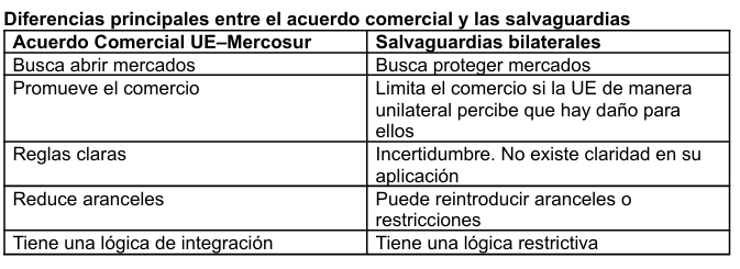 Estas, son las diferencias principales entre el acuerdo comercial y las salvaguardias, según la UGP.