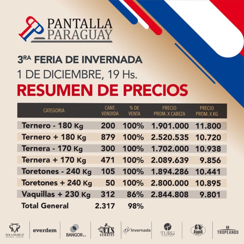El consorcio Pantalla Paraguay concretó ayer su tercera feria de invernada con una colocación del 98% de una oferta de 2.367 desmamantes machos y hembras marca líquida.