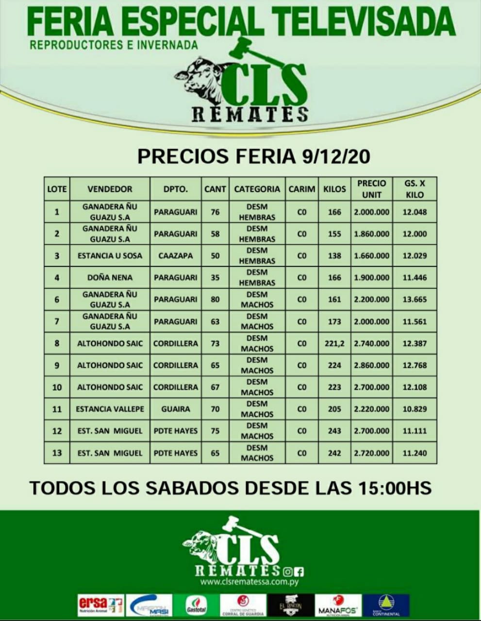 Resultados. Las desmamantes hembras carimbo 0, con un peso de 138 a 166 kilos, promediaron Gs. 1.855.000 por unidad (Gs. 11.881 por kilo vivo) y lograron un máximo de Gs. 12.048. Los desmamantes machos carimbo 0, entre 161 y 243 kilos, hicieron una media de Gs. 2.517.500 (Gs. 11.959 por kilo vivo), con un máximo de Gs. 13.665.