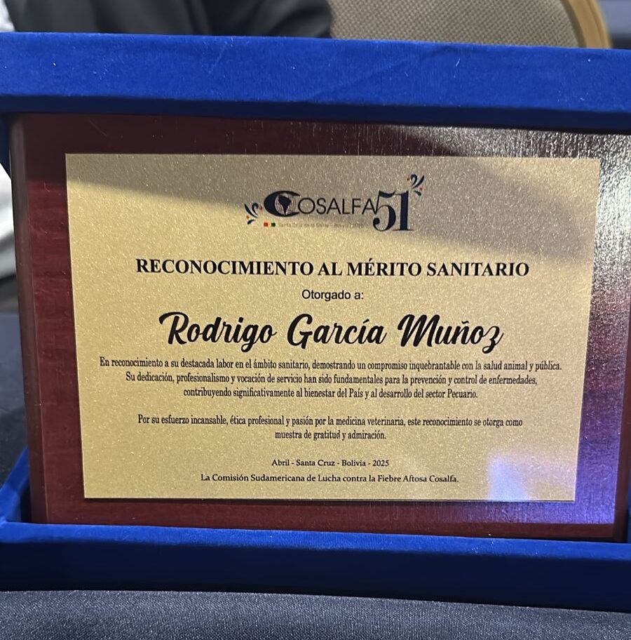 El médico veterinario paraguayo Rodrigo García recibió una distinción de honor al mérito por sus trabajos en salud animal a nivel internacional. El premio fue entregado en el marco de la 51° asamblea ordinaria de la Comisión Sudamericana de Lucha contra la Fiebre Aftosa (Cosalfa) que se está celebrando en Santa Cruz de la Sierra en Bolivia.